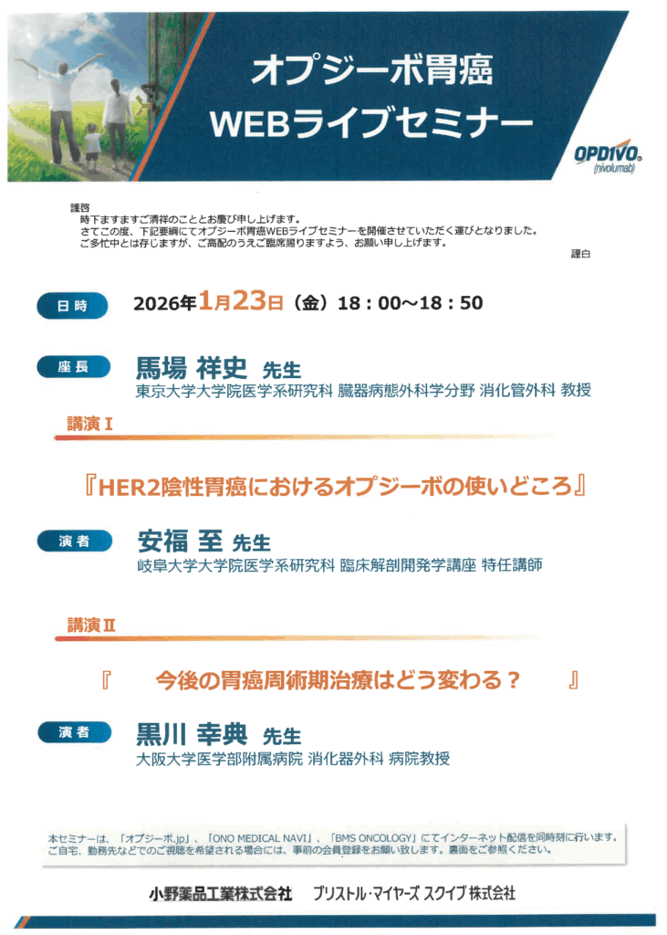 2026.01.23 教室日記 オプジーボ胃癌 WEBライブセミナー 2026年1月23日(金)、オプジーボ胃癌 WEBライブセミナーが開催されました。 講演Ⅰでは安福至先生が「HER2陰性胃癌におけるオプジーボの使いどころ」をご講演されました。
