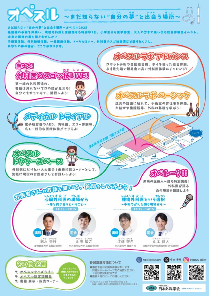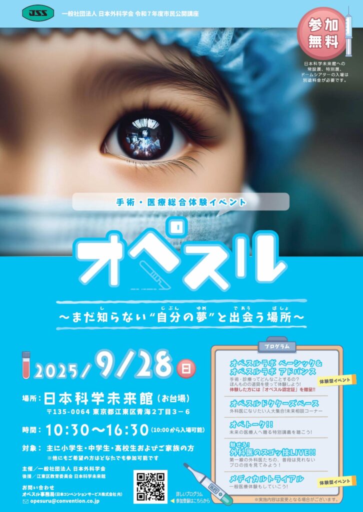 2025年9月28日(日)、東京お台場の日本科学未来館にて、子どもたちが本物の手術器具や外科医とふれあうイベント「第51回市民講座 オペスル ~まだ知らない“自分の夢”と出会う場所~」が、日本外科学会の主催で開催されました。