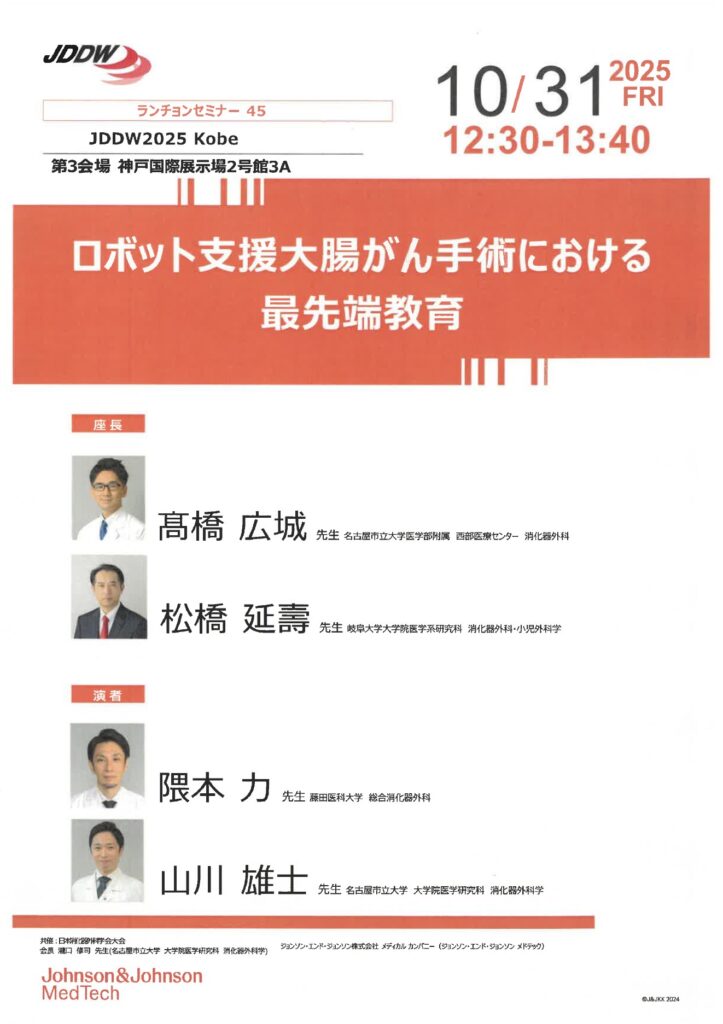 2025.10.31 教室日記 ロボット支援大腸がん手術における最先端教育 2025年10月31日(金)、JDDW2025 Kobeにて、ランチョンセミナー「ロボット支援大腸がん手術における最先端教育」が開催されました。 当科の松橋延壽教授が座長をおつとめに成りました。