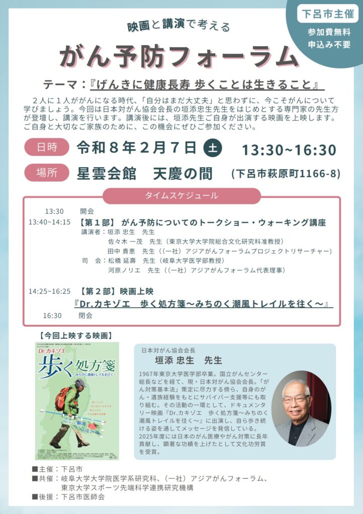 2026.02.07 教室日記 下呂市 市民公開講座 2026年2月7日、下呂市の星雲会館にて、下呂市 市民公開講座「がん予防フォーラム」が開催されました。 松橋延壽教授が参加され、がん予防についてのトーキングショー等がおこなわれました。
