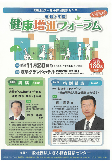 2025.11.28 教室日記 令和7年度 健康増進フォーラム 2025年11月28日(金)、岐阜グランドホテルにて「令和7年度 健康増進フォーラム」が開催されました。 第1部講演では松橋延壽教授が「大腸がんは防げる・治せる~運動・健診・ロボット手術~」を講演頂きました。