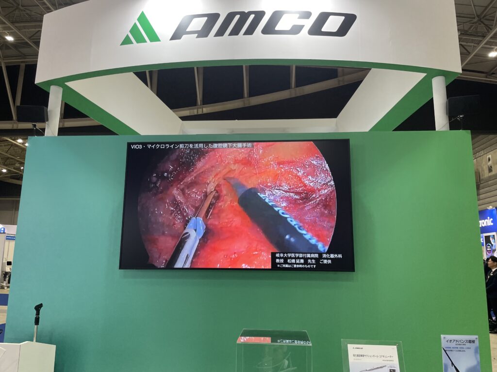 また、アムコ社ブースでは、松橋延壽教授による「マイクロライン剪刀を活用した腹腔鏡下大腸手術」がループビデオで放映されました。