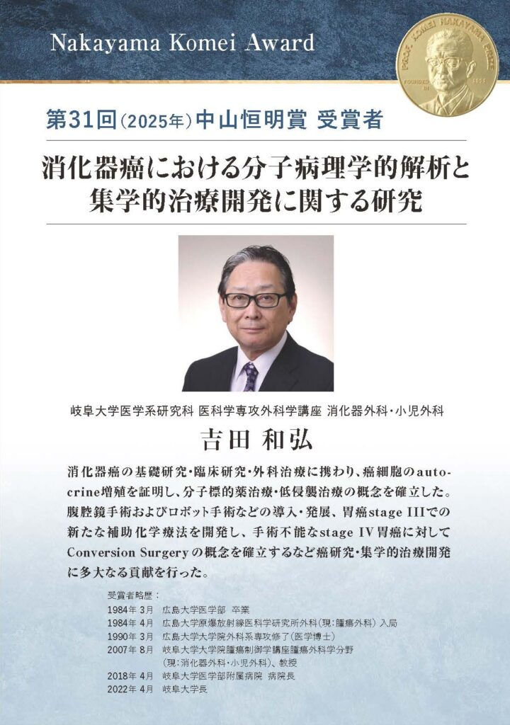 吉田和弘学長が、第 31 回(2025年)日本癌治療学会 中山恒明賞を受賞されました。