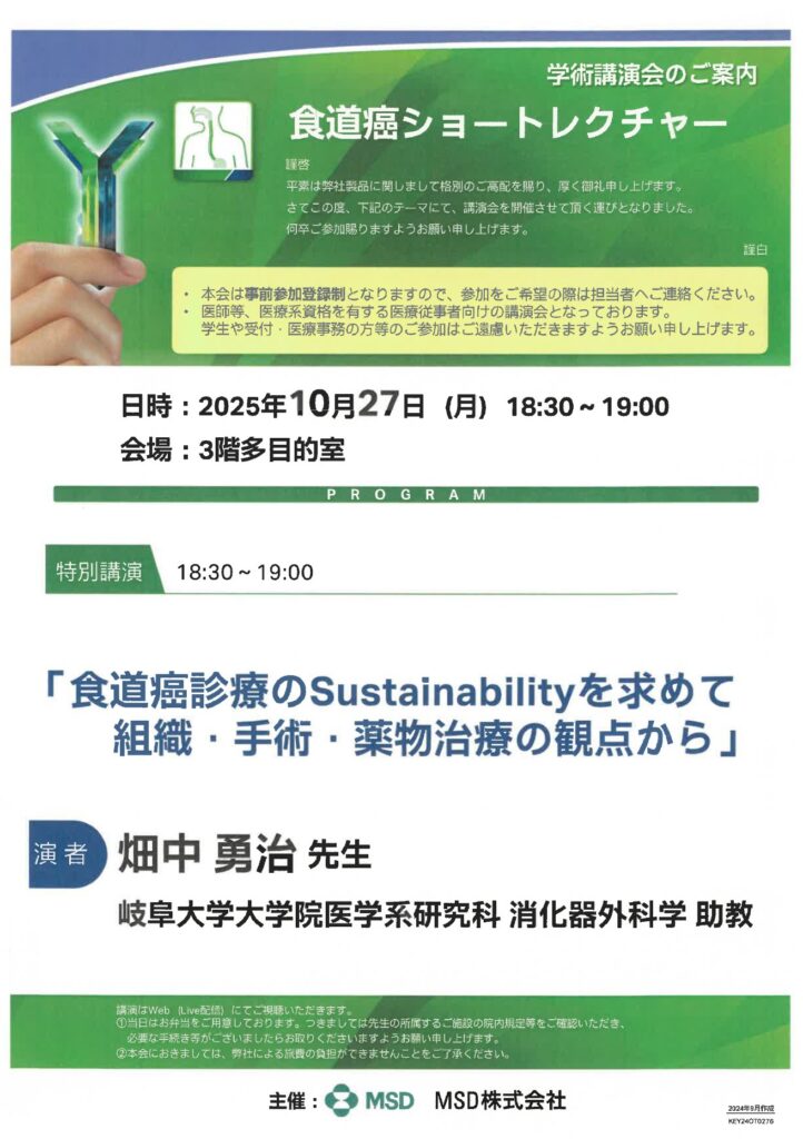 2025.10.27 教室日記 食道癌ショートレクチャー 2025年10月27日(月)、「食道癌ショートレクチャー」が開催されました。 当科の畑中勇治先生が、「食道癌診療のSustainabilityを求めて 組織・手術・薬物治療の観点から」をご講演されました。