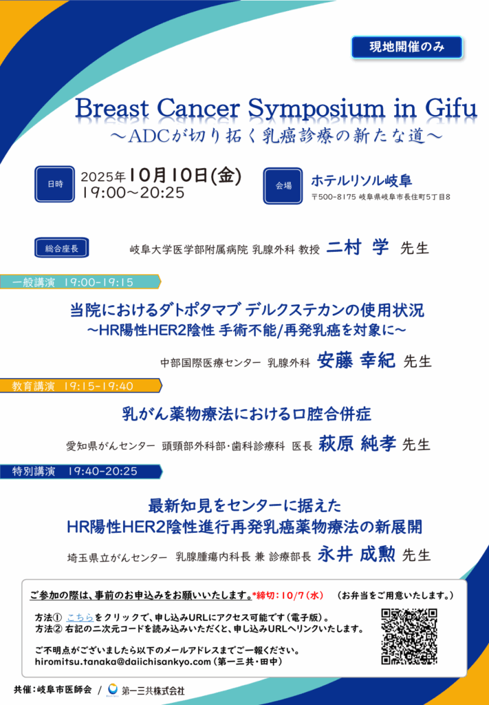 2025年10月10日(金)、ホテルリソル岐阜にて「Breast Cancer Symposium in Gifu ~ADCが切り拓く乳癌診療の新たな道~」が開催されました。