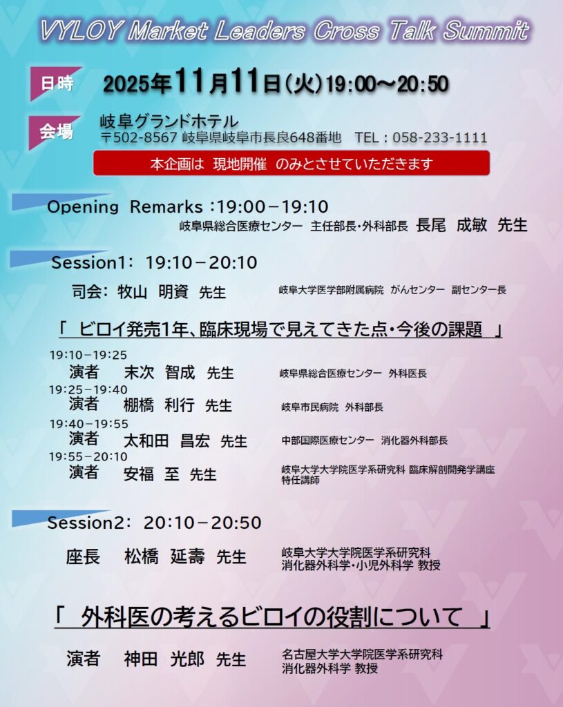 Session 2では、松橋延壽教授に司会をおつとめ頂き、名古屋大学 消化器外科 教授・神田光郎先生に、「外科医の考えるビロイの役割について」をご講演いただきました。